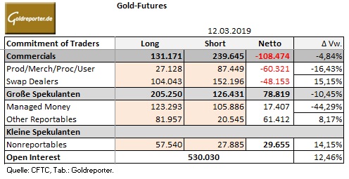 Die aktuellen CoT-Daten vom Handel mit Gold-Futures an der US-Warenterminbörse COMEX zeigen per 12. März folgende Veränderungen in den Positionen der größten Händlergruppen. Die Netto-Short der „Commercials“ ist gegenüber Vorwoche um knapp 5 Prozent gesunken auf 108.474 Kontrakte. Die Untergruppe der „Swap Dealers“ hat ihre Netto-Verkäufe dagegen um 15 Prozent aufgestockt auf 48.153 Kontrakte.