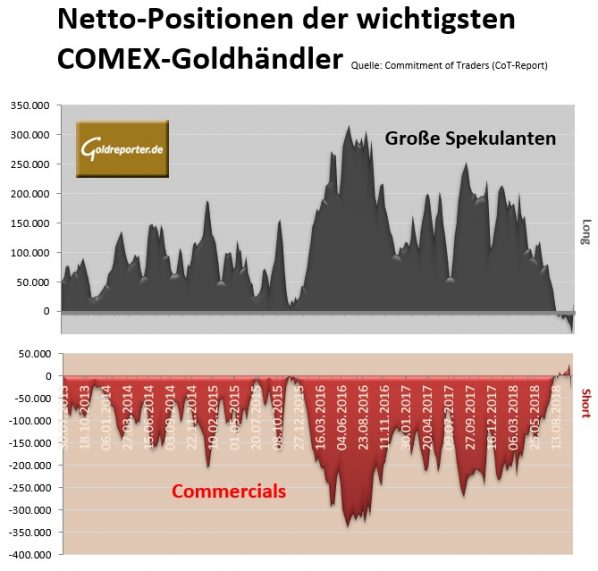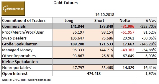 Bei den „Commercials“ wurde aus einer Netto-Short-Position von 25.865 Kontrakten per 16. Oktober 2018 eine Netto-Long-Position von 31.996 Kontrakte. Es kam hier somit zu einer dramatischen Netto-Umschichtung von 57.862 Kontrakten, was Goldkäufen von knapp 180 Tonnen Gold entspricht. Dabei halbierte sich die nach wie vor bestehende Netto-Long-Position der „Swap Dealers“ (darunter Großbanken) auf 29.961 Kontrakte. Die Netto-Short-Position der eigentlichen kommerziellen Händler („Pro/Merch/Proc/User“) stieg um 81 Prozent auf 61.957 Kontrakte.