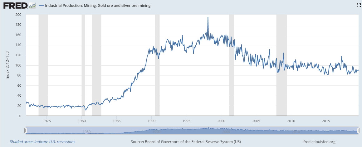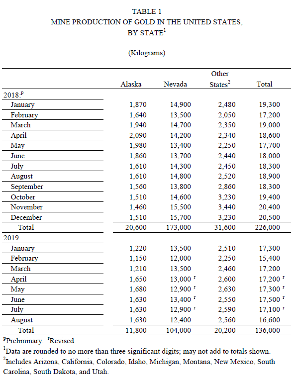 Die Acht-Monats-Zahlen liegen nun mit 136 Tonnen 7,7 Prozent unter Vorjahr. Wie in anderen Abbauregionen der Welt, leidet die US-Goldindustrie unter sinkendem Goldgehalt im Erz, wenigen bis keinen Entdeckungen neuer Lagerstätten, steigenden Kosten des Goldabbaus und der Exploration sowie unter Problemen bei der Projektfinanzierung.