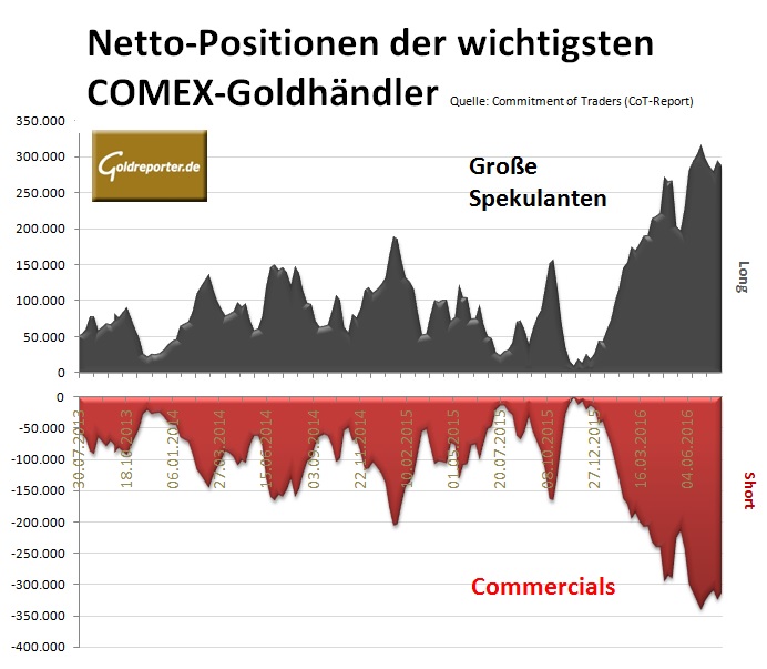 Die aktuellen CoT-Daten zur Handelsaktivität der größten Goldhandelsgruppen an der US-Warenterminbörse COMEX zeigen per 16.08. einen nur einen leichten Rückgang der Netto-Positionen.