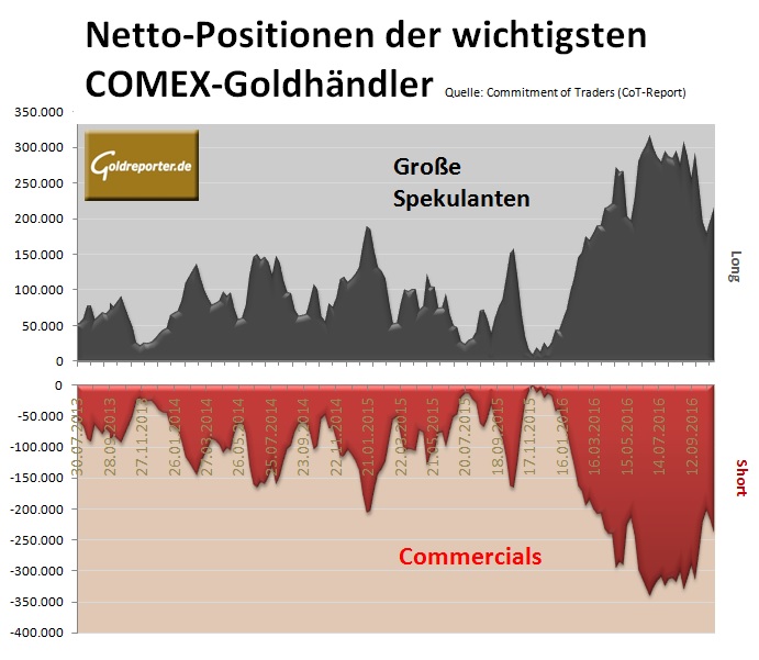 Laut dem jüngsten Commitment-of-Traders-Report ist die Netto-Short-Position der „Commercials“ per 1. November 2016  um knapp 10 Prozent auf 239.251 Kontrakte gesunken. Es war die höchsteVerkaufsposition seit dem 4. Oktober 2016.