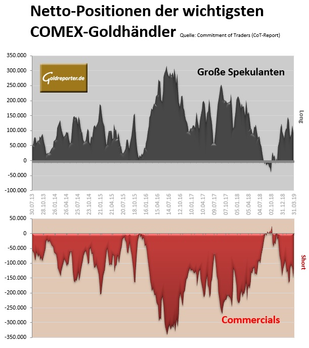 Auf dem Goldmarkt geht es derzeit rauf und runter. Das zeigt sich nicht nur im Handelsverlauf am vergangenen Freitag sondern auch bei den CoT-Daten der vergangenen beiden Wochen. Die aktuellen Zahlen vom Handel mit Gold-Futures an der US-Warenterminbörse COMEX weisen per 2. April 2019 folgende Veränderungen in den Positionen der größten Händlergruppen auf.