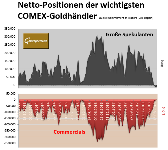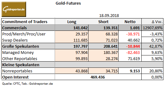 Die „Großen Spekulanten“ waren im amerikanischen Handel mit Gold-Futures per 18. September 2018 in der sechsten Woche in Folge netto-short positioniert.