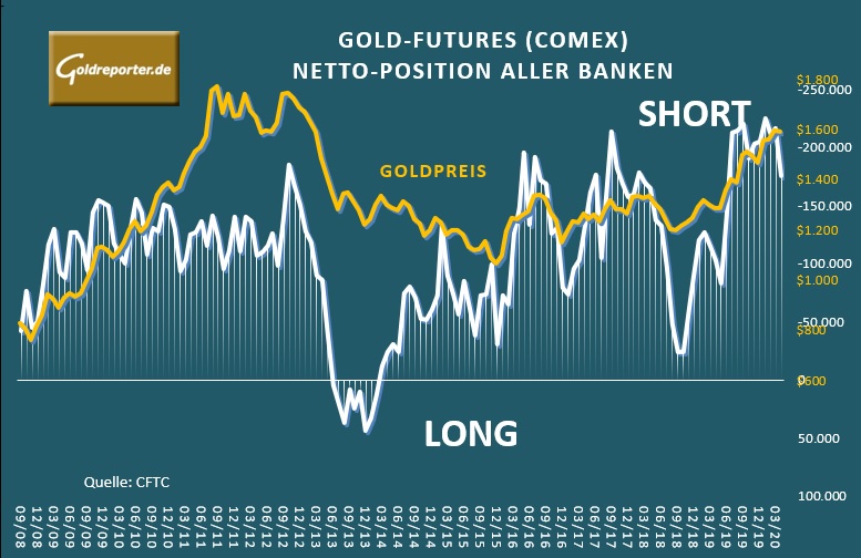 Laut den aktuellen BPR-Daten waren per 7. April 2020 insgesamt nur noch 32 Banken im Handel mit Gold-Futures engagiert. Im Vormonat waren es noch 38 Institute. Die Zahl der US-Banken hat sich von fünf auf vier reduziert. Dabei ist die Netto-Short-Position aller Banken gegenüber Vormonat um 19 Prozent gesunken auf 175.124 Kontrakte. Das ist der niedrigste Wert seit Juni 2019. Die vier verbliebenen US-Banken reduzierten ihre Netto-Verkäufe sogar um 27 Prozent (auf 78.985 Kontrakte).
