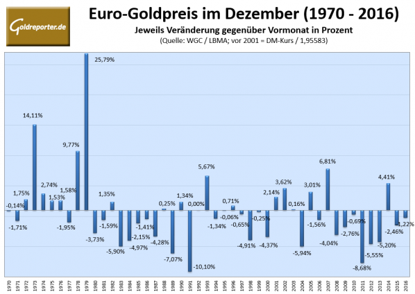 Statistisch gesehen ist der Dezember kein guter Monat für Goldanleger. Im Zeitraum seit 1970 verbuchte der Euro-Goldpreis ein Minus von durchschnittlich 0,17 Prozent. In 28 von 46 Fällen (61 %) endete der Dezember mit Abschlägen gegenüber Vormonat.