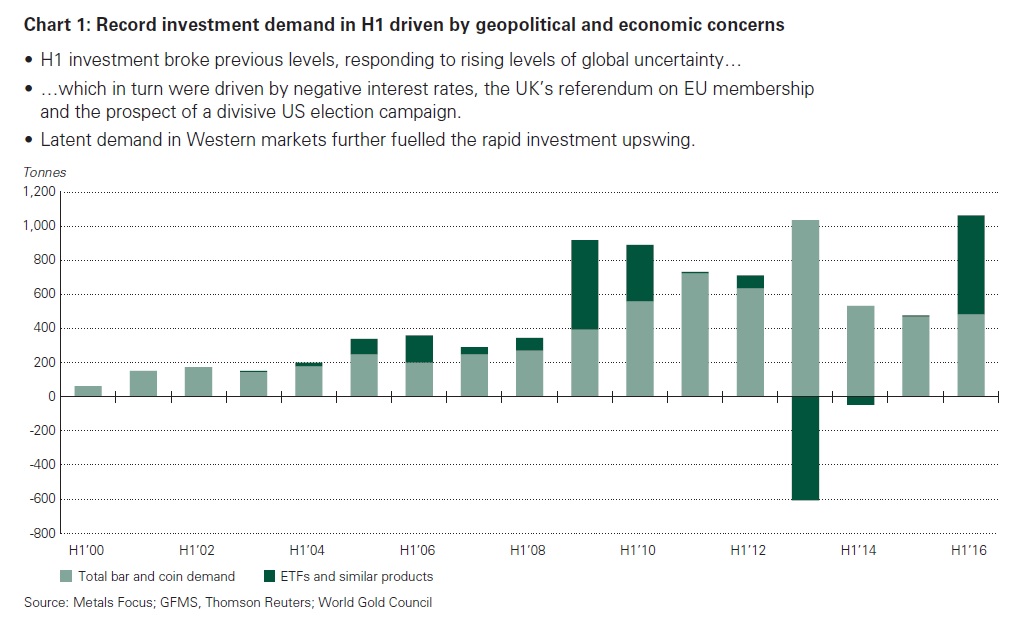 Die wirtschaftlichen und politischen Unsicherheiten weltweit haben die Nachfrage nach Goldinvestments im ersten Halbjahr 2016 stark ansteigen lassen.