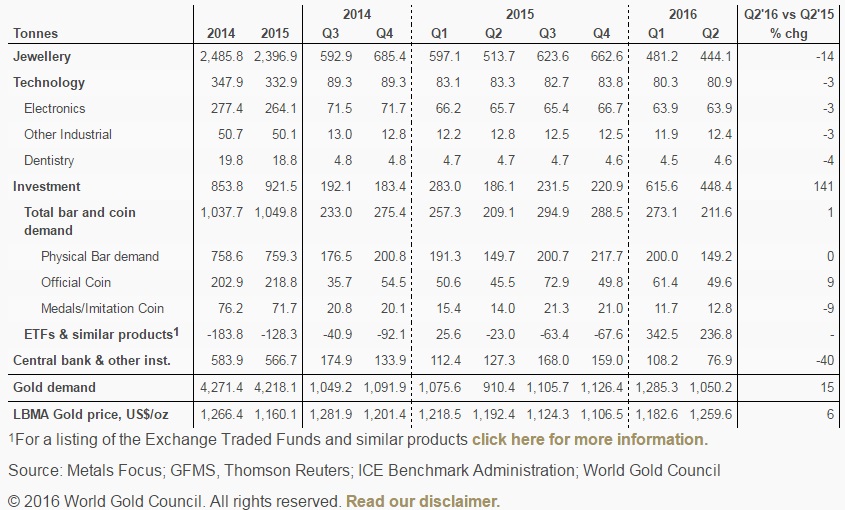 Im zweiten Quartal 2016 lag die weltweite Goldnachfrage insgesamt bei 1.050,2 Tonnen und damit 15 Prozent über Vorjahr. Im Vergleich zum Vorquartal wurde aber 18 Prozent weniger Gold über alle Verwendungsformen hinweg nachgefragt. Die Nachfrage nach Anlagegold wird für das vergangene Quartal mit 448,4 Tonnen beziffert. Das waren 141 Prozent mehr als im Vorjahresquartal aber 27 Prozent weniger als im 1. Quartal 2016.