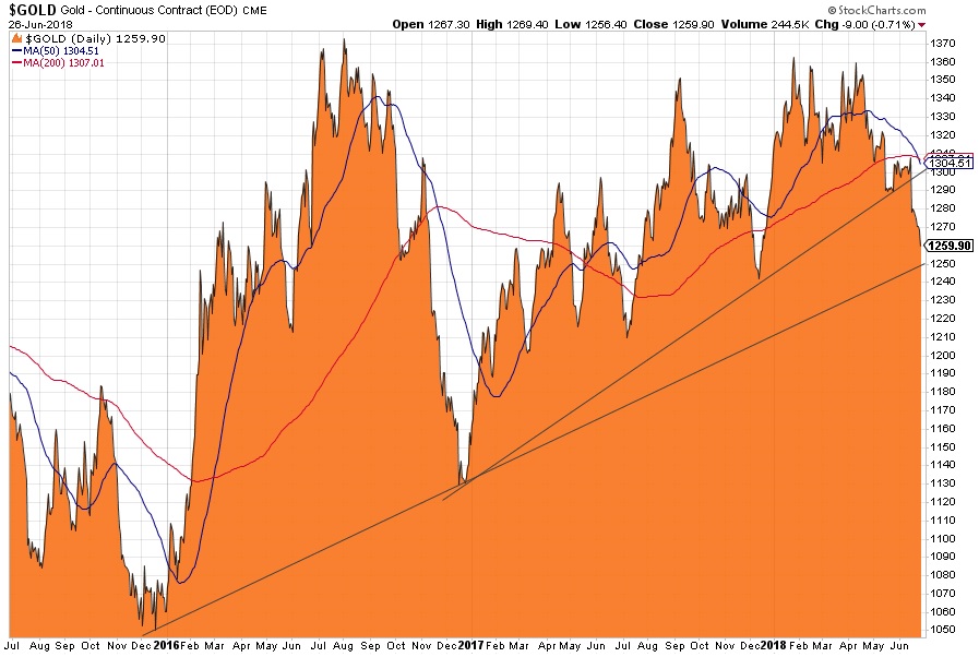 Und nun steht auch der Ende 2016 etablierte Aufwärtstrend zur Disposition. Die entsprechende Gerade schneidet die Kursachse bei $ 1.250. Und bei $ 1.240 befindet sich zusätzlich eine bedeutende Unterstützung. Hier ereigneten sich Ende 2017 ein markantes Zwischentief. Sollten beide Support fallen, dann könnte es aus charttechnischer Sicht in der zweiten Jahreshälfte noch ungemütlicher werden für Goldinvestoren.