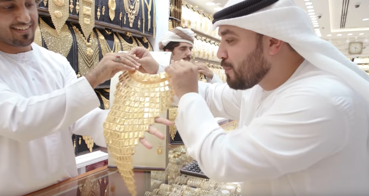 Der YouTuber Khalid Al Ameri führt seine Zuschauer in einem Beitrag durch den Goldmarkt der Stadt, er präsentiert schier unglaubliche Schmuckstücke. In einem Goldladen lässt er sich das teuerste Goldkleid zeigen. Der Preis: 3 Millionen Dirham. Das entspricht rund 750.000 Euro. Wünschen Sie vielleicht eine neue, nicht weniger dekadente Goldanlageform? Dann gäbe es einen feinen Halsschmuck – oder soll man es Brustteppich nennen? Er setzt sich aus einer Vielzahl kleiner Goldbarren zusammen. Al Ameri erklärt in seinem Videobeitrag auch, mit welcher Taktik man in einem Goldgeschäft in Dubai den besten Preis erzielt – nicht ohne Augenzwinkern. Und wie bringt man sein Gold aus Dubai ordnungsgemäß zurück in die Heimat? Das lesen Sie in unserem Spezial Report Mit Gold durch den Zoll.