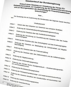 Die Bundesregierung hat nun auch den gesamten Gesetzentwurf veröffentlicht. Er ist 218 Seiten stark und kann hier im Internet abgerufen werden: Entwurf Neuordnung Geldwäschegesetz