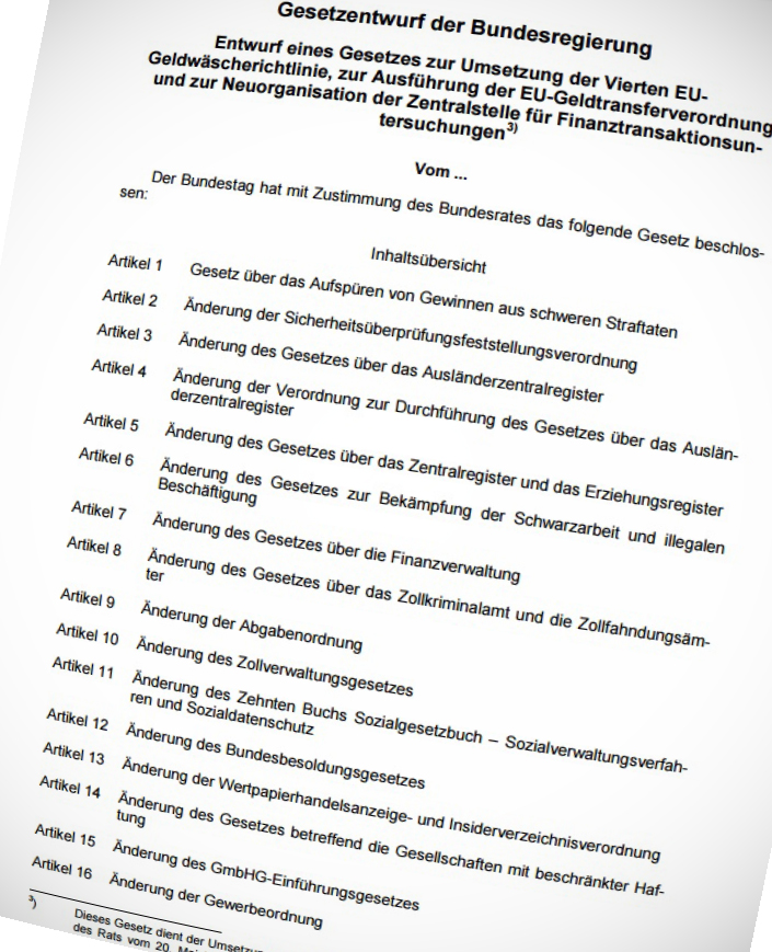 Der Entwurf enthält neben dem gesamten Gesetzestext auch umfangreiche Erklärungen und Kommentare zur Initiative, mit der Deutschland die Vierte EU-Geldwäscherichtlinie umsetzen will.