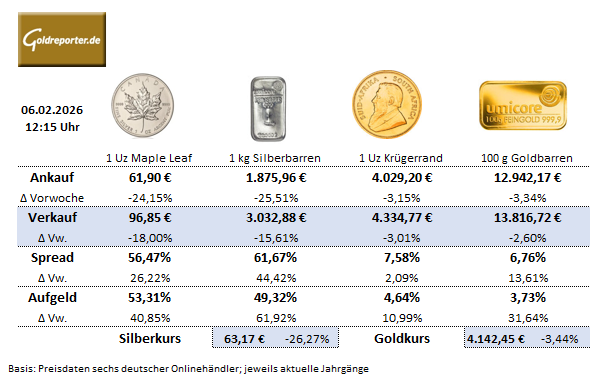 Die aktuelle Goldreporter-Preisabfrage bei sechs deutschen Edelmetallhändlern (Vergleich zum 30. Januar 2026) ergibt folgendes Bild: