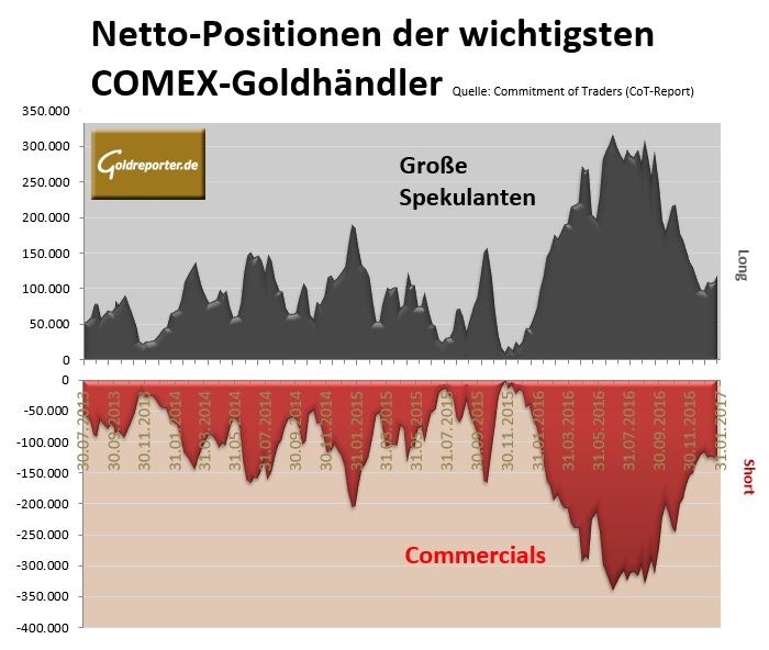 Die Zahlen per 31. Januar zeigen nun einen weiteren Anstieg der Netto-Short-Position in den Händen der „Commercials“ um 4,3 Prozent auf 131.803 Kontrakte. Die Netto-Long-Position der „Großen Spekulanten“ stieg sogar um 8,91 Prozent auf 119.155 Kontrakte.