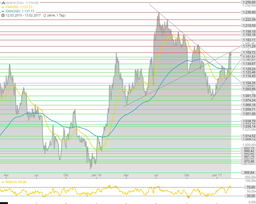 Denn exakt auf dem aktuellen Niveau setzte Anfang März 2016 eine Konsolidierung ein. Kurzzeitig konnte man die Goldunze noch einmal rund 100 Euro günstiger einkaufen.