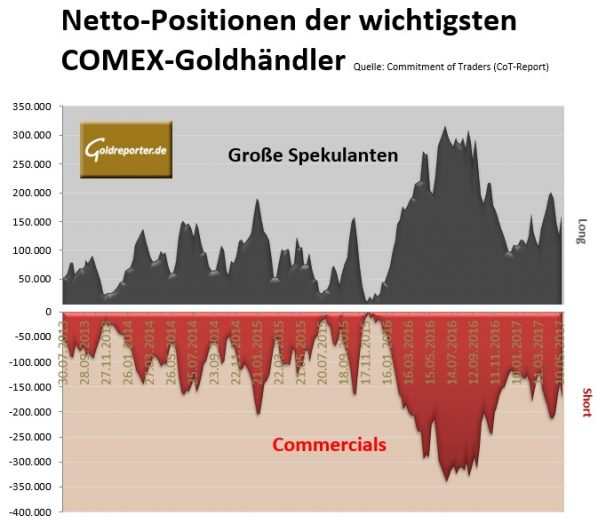 Die Netto-Short-Position der „Commercials“ stieg gegenüber Vorwoche um 22 Prozent auf 174.291 Kontrakte. Jene „Swap Dealers“, eine Untergruppe der „Commercials“, zu denen auch Großbanken gehören, hat sich annähernd verdoppelt (+92 %).