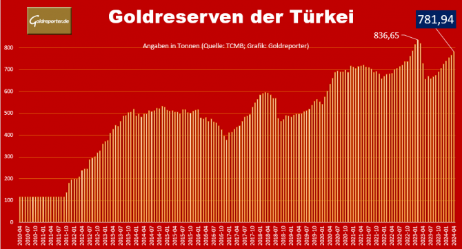 Währenddessen verzeichnete die türkische Zentralbank innerhalb eines Jahres einen Anstieg der monetären Goldreserven um 11,5 Prozent oder 6 Milliarden US-Dollar. Aber gemessen am Goldgewicht bleibt der Rekordstand vom Februar 2023 bestehen – mit 836,65 Tonnen (26,899 Mio. Unzen).