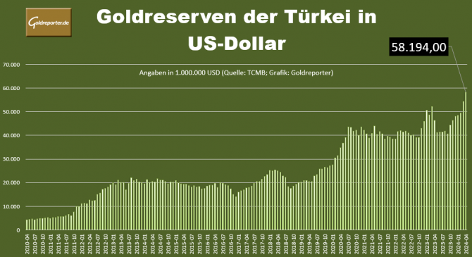 Aber während die Goldbestände der Türkei innerhalb von zwölf Monaten um rund 38 Tonnen oder 4,6 Prozent gesunken sind, stieg der Gold-Wert im April erneut auf ein Rekordhoch. Denn mit 58,19 Milliarden US-Dollar ergibt sich gegenüber Vormonat eine Zunahme um 7 Prozent, was auch dem starken Goldpreis-Anstieg zu verdanken ist. Dabei nahm auch der Gold-Anteil an den Gesamtreserven von zuletzt 44 Prozent auf nun 47 Prozent zu.