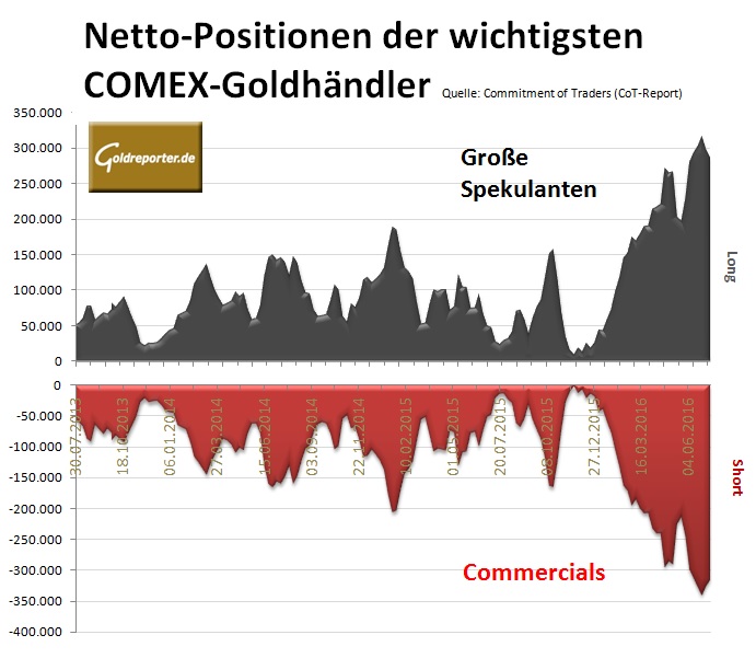Die Netto-Short-Position der „Commercials“ ist im Zuge eines schwächeren Goldpreises die zweite Woche in Folge gesunken.