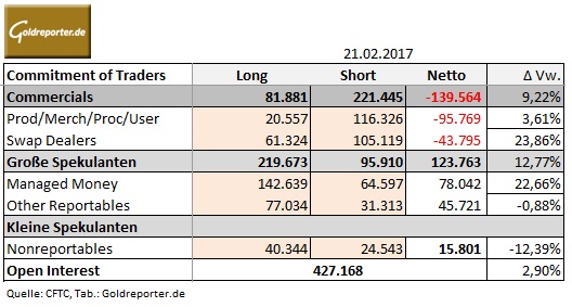 Die aktuellen CoT-Daten vom US-Terminmarkt zeigen steigende Aktivität im Handel mit Gold-Futures per 21. Februar 2017.