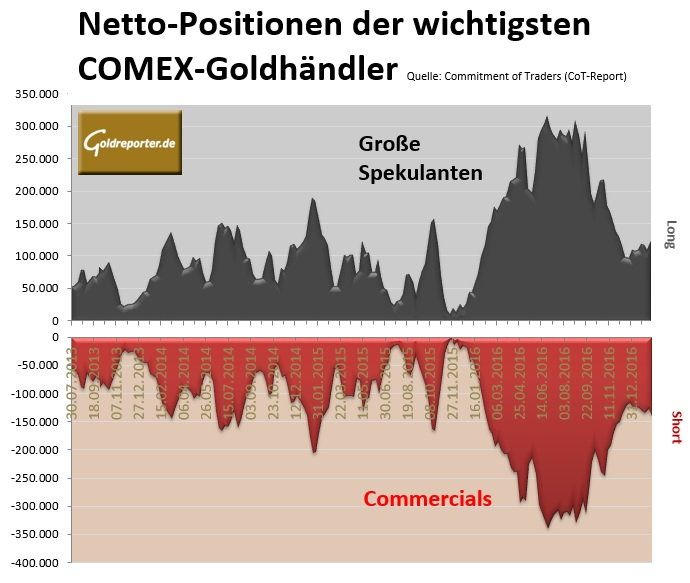 Die Netto-Short-Position der „Commercials“ stieg gegenüber Vorwoche um 9,22 Prozent auf 139.564 Kontrakte. Vor allem die Untergruppe der „Swap Dealers“ trug zu dem Anstieg bei. Deren Netto-Verkäufe gingen um knapp 23,86 Prozent nach oben.