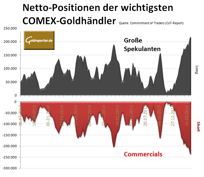 In der „Wellenreiter-Grafik“ sieht man neben den Wetten der Spekulanten und Commercials auch den letzten Goldpreis vom 19.4.16: $1250,-/Unze.