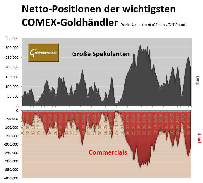 Per 3. Oktober ist die Netto-Short-Position der „Commercials“ noch einmal um knapp 4 Prozent auf 224.423 Kontrakte gesunken. Das entspricht dem Niveau von Mitte August. Erneut war es die Untergruppe der „Swap Dealers“, die daran den größten Anteil hatte. Deren Netto-Verkäufe gingen um rund 12 Prozent zurück auf 34.485 Kontrakte.