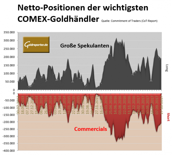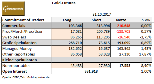 Die aktuellen CoT-Daten per 31. Oktober 2017 zeigen im US-Handel mit Gold-Futures gegenüber Vorwoche folgende Veränderungen.