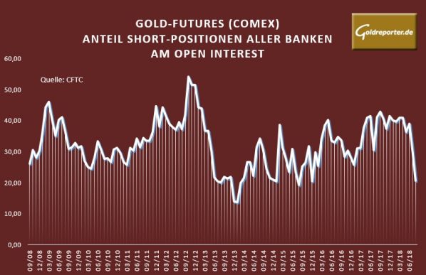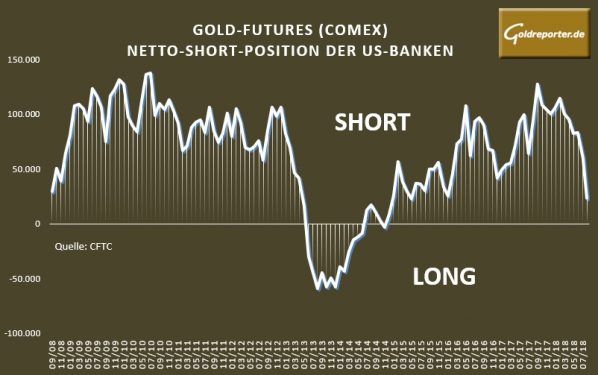Der aktuelle monatliche Bank Participation Report der US-Börsenaufsicht CFTC zeigt bei Gold einen starken Rückgang der Netto-Verkäufe durch US-Banken an der US-Warenterminbörse COMEX per 7. August 2018. Deren Netto-Short-Position im Handel mit Gold-Futures sank gegenüber Vormonat um 61 Prozent auf 22.961 Kontrakte.