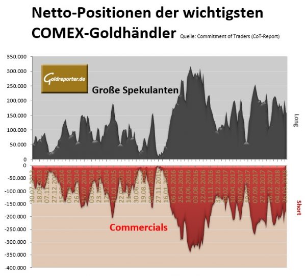 Die aktuellen CoT-Daten vom Handel mit Gold-Futures an der US-Warenterminbörse COMEX zeigen per 10. April 2018 folgende Veränderungen in den Positionen der bedeutendsten Händlergruppen.