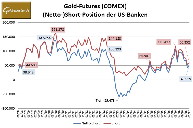 Die US-Banken waren Anfang Januar mit nur noch 152 Tonnen Gold netto-short. Zuletzt haben sich diese Goldhändler aber wieder etwas stärker auf der Short-Seite betätigt.