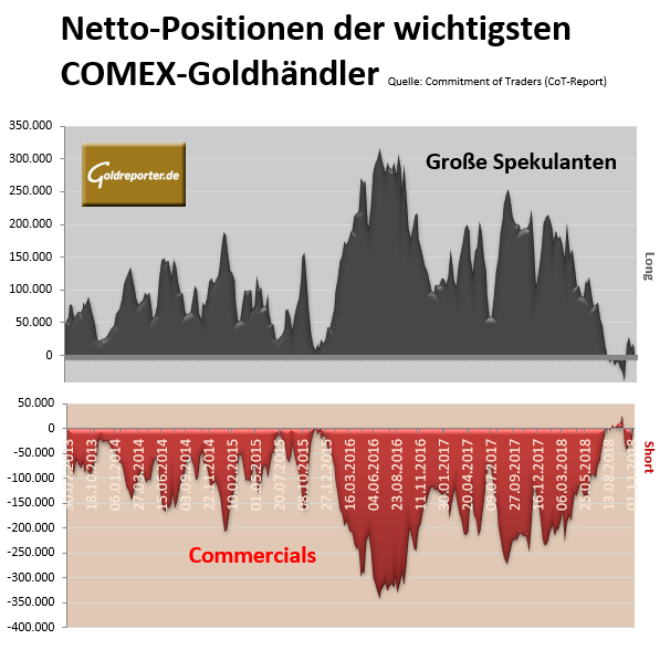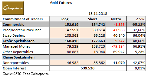 Die aktuellen CoT-Daten vom Handel mit Gold-Futures an der US-Warenterminbörse COMEX zeigen per 13. November 2018 folgende Veränderungen in den Positionen der größten Händlergruppen.