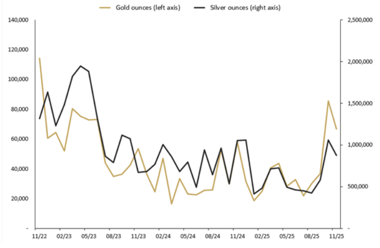 Nach der kurzen Belebung im Oktober kehrt die Perth Mint damit in eine schwächere Absatzphase zurück, die seit Ende 2023 anhält.
