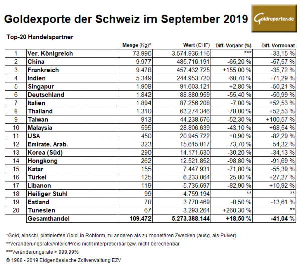 Die Eidgenössische Zollverwaltung hat die Außenhandelsdaten der Schweiz per Ende September 2019 veröffentlicht. Darin enthalten sind auch die Goldexporte und Goldimporte. Die Schweiz verfeinert rund die Hälfte des weltweit nachgefragten Goldes. Im vergangenen Monat lieferte die Schweiz 109,47 Tonnen Gold im Wert von 5,27 Milliarden CHF (4,789 Mrd. Euro) ins Ausland.