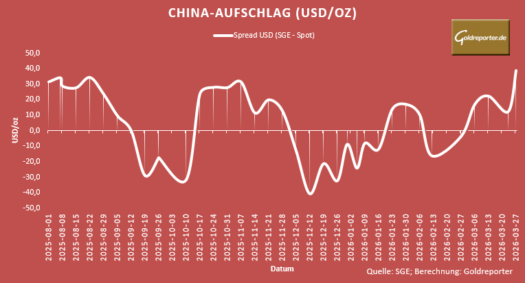 Aufschlag China → Europa Spot: +39 USD/oz (23.03.26: 12 USD); Δ: +27 USD
