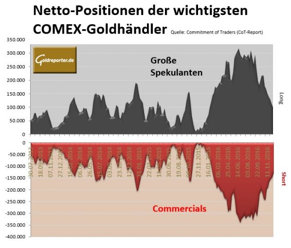 Auch in der letzten Handelswoche des Jahres 2016 haben die kommerziellen Händler an der COMEX noch einmal Goldkäufe auf Termin getätigt. Die Netto-Short-Position der „Commercials“ ging gegenüber Vorwoche um knapp 10 Prozent zurück auf 120.867 Kontrakte.