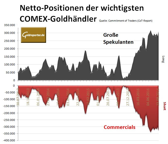 Die Netto-Short-Position der „Commercials“ (darunter die Großbanken) stieg per 06.09.2016 um 9,55 Prozent auf 329.973 (Futures-)Kontrakte. Im Gegenzug nahm die Netto-Long-Position der „Großen Spekulanten“ um 11,41 Prozent auf 307.860 Kontrakte zu.