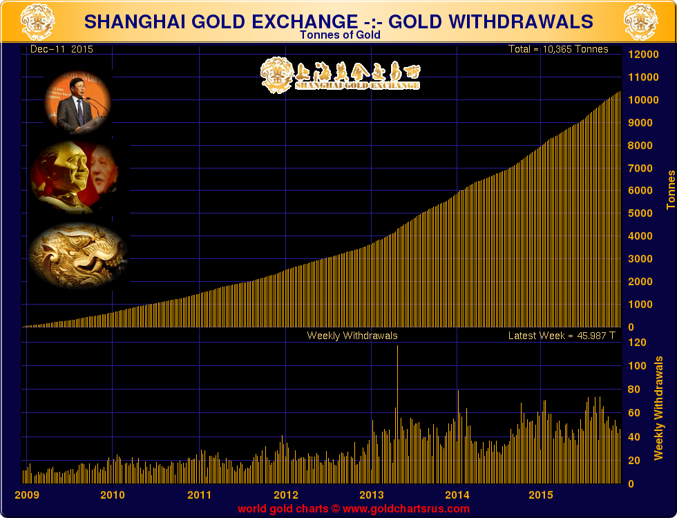 Folgt man jedoch den Spuren des GOLDES auf dem Weg von West nach Ost, so reibt man sich erstaunt die Augen, wenn die offiziellen Zahlen der SGE (Shanghai Gold Exchange) für das Jahr 2015 bisher eine Summe von 10.365 Tonnen Gold bestätigen, die nach China geflossen sind.