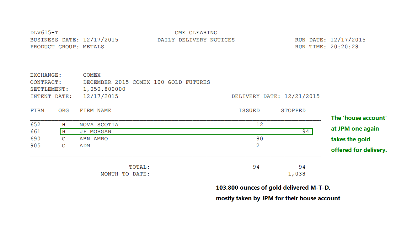 im Verschiebbahnhof der Bullionbanken: NOVA SCOTIA, ABN AMRO und ADM müssen ihre 94 Gold-Kontrakte erneut an den „BIG Player“ JP.Morgan abliefern; bisher schluckte JPM 103.800 Goldunzen (oder 3,22 Tonnen).