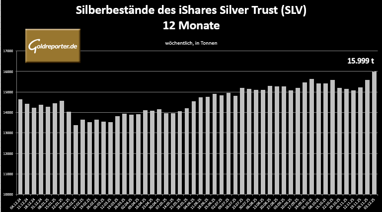 Die SLV-Bestände kletterten auf 15.999 Tonnen und erreichten damit ein neues Jahreshoch. Die Grafik zeigt die wöchentliche Entwicklung der vergangenen zwölf Monate.