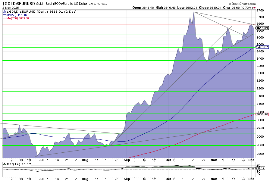 Auch der Euro-Goldpreis bleibt im klaren Aufwärtstrend und schloss am 3. Dezember bei 3.619 EUR. Der Markt zeigt – trotz erhöhter Volatilität – eine stabile Struktur mit fortgesetzter Serie höherer Tiefs.