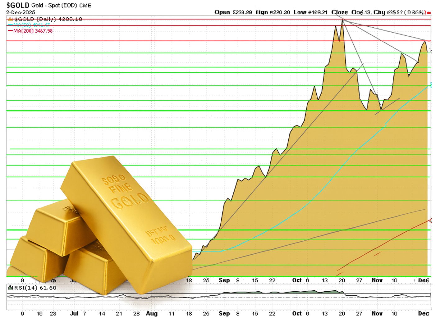 Damit hat sich Gold der November-Konsolidierung erneut über die Marke von 4.200 USD geschoben. Das Chartbild zeigt einen technisch weiterhin intakten Aufwärtstrend, der von einer klaren Abfolge höherer Tiefs geprägt wird. Der RSI notiert mit 61,6 im neutral-überhitzten Bereich.