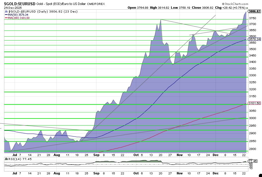Kurzfristige Unterstützungen liegen nun bei 3.740 EUR, 3.700 EUR und 3.645 EUR. Mit einem RSI von 77 ist auch der Euro-Goldpreis technisch überkauft. In der Phase um das Oktoberhoch wurden allerdings bereits deutlich höhere Werte erreicht.