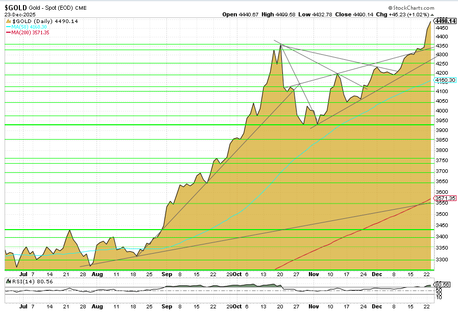 Der Goldpreis schließt im US-Futures-Handel nahe 4.500 USD auf Rekordniveau. Das Momentum ist stark, aber die technische Überhitzung nimmt zu.