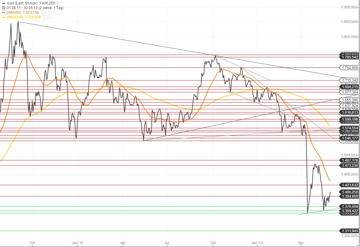 Aus charttechnischer Sicht wäre nun ein Tagesschlusskurs oberhalb von 1.400 US-Dollar als wichtiges Zeichen für eine vollendete Bodenbildung zu interpretieren (siehe Abbildung unten). Am US-Terminmarkt besitzen Spekulanten und Hedgefonds weiterhin Rekord-Positionen auf der Short-Seite. Das heißt, man setzt auf weiter fallende Kurse. Diese Situation war in der Vergangenheit jedoch geradezu Voraussetzung für eine nachhaltige Kursentwicklung in die Gegenrichtung. Eine kräftige Eindeckungsrally wäre bei steigendem Kursverlauf zu erwarten.