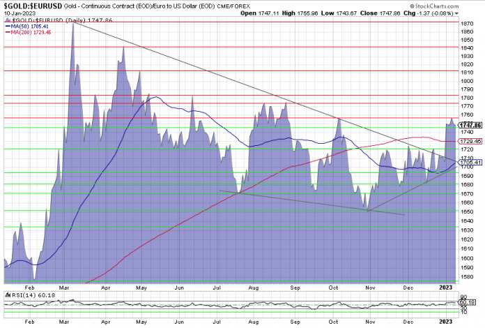 Am gestrigen Dienstag schloss der Goldpreis auf Basis der US-Futures mit 1.876,50 pro Unze (Februar-Kontrakt). Das entsprach knapp 1.748 Euro. Damit hat Gold seit Jahresbeginn 2,8 Prozent beziehungsweise 2,5 Prozent zugelegt. Damit stabilisierte sich der Euro-Goldpreis nach dem Ausbruch aus dem 10-monatigen Abwärtstrend auf dem Niveau der Vorwoche (Goldpreis: Was für ein Kursausbruch!). Wir betrachten der Euro-Goldchart per 10. Januar 2023.