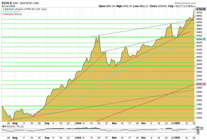 Der Goldpreis hat den Dienstag bei 4.758 US-Dollar je Unze (CME Spot) beendet und damit ein weiteres Allzeithoch markiert. Auf Wochensicht entspricht das einem Plus von 3,8 Prozent. Seit Jahresbeginn summiert sich der Anstieg inzwischen auf rund 10 Prozent.