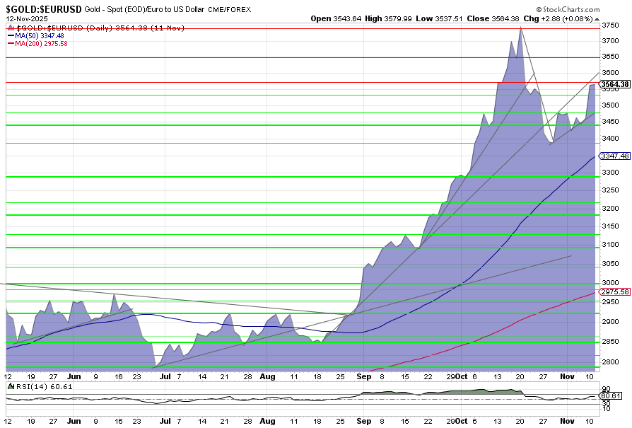 Die Goldpreis gewinnt wieder an Dynamik. Nach der Konsolidierung der vergangenen Wochen hat sich ein charttechnischer Boden gebildet. Am Dienstag beendete das Edelmetall den US-Futures-Handel mit 4.130 US-Dollar je Unze (Lieferung Ende November). Der Kurs entsprach 3.564 Euro. Damit legte Gold innerhalb einer Woche um 5 Prozent (in USD) und 4 Prozent (in EUR) zu. Aufgrund des schwächeren Dollar-Kurses fiel die Euro-Performance etwas geringer aus. Der Abstand zum Allzeithoch beträgt noch 5 Prozent (4,8 % in EUR).