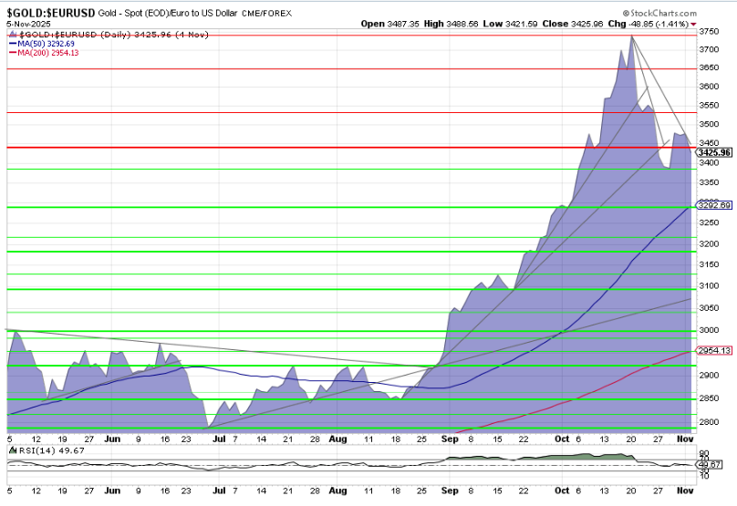 Charttechnische Darstellung der Euro-Goldpreises, 6 Monate, auf Basis der US-Futures, Tagesschlusskurse (Continuous Contract) per 4. November 2025.