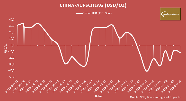Der chinesische Goldmarkt liefert derzeit keine direkten Preissignale für den Weltmarkt. In der vergangenen Woche wurde Gold an der Shanghai Gold Exchange (SGE) erneut unter dem europäischen Spotniveau gehandelt. Am Freitag lag der Abschlag bei rund 12 US-Dollar je Feinunze. Noch vor etwa sechs Wochen hatte China dagegen einen Aufschlag von 13 US-Dollar gezahlt.