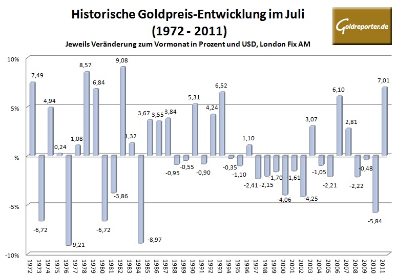 Die Goldpreis-Statistik der vergangenen 40 Jahre zeigt, dass sich im Monat Juli oft starke Kursbewegungen ereignen. 2011 stieg der Goldpreis um 7 Prozent.